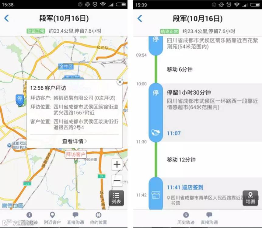 定位轨迹模块:在工作时间段内,可以对员工进行实时位置的获取,系统会定时上报员工位置信息,形成工作路线,管理员可以对工作人员进行实时掌握,保证了员工外出工作的真实性;通过行程时间线可以了解到员工工作饱和度,保证员工按照既定的计划执行工作;通过轨迹路线,进行在外工作核销及报差旅费等。