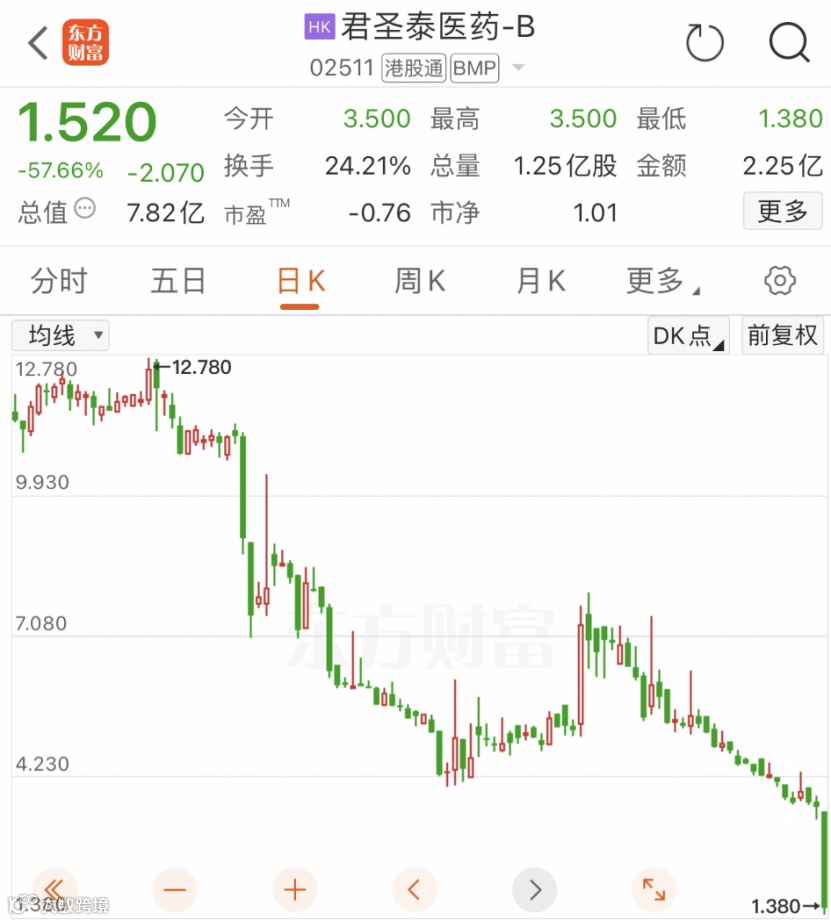 今日港股开盘后,君圣泰医药-B(02511)股价持续走低,盘中最大跌幅超61%,截至收盘,跌幅仍高达57.66%,报收1.52港元,创上市以来最低收盘价,全天成交额达1.98亿港元。