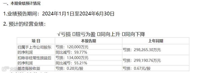 昨日晚间,新希望发布2024年半年度业绩预告。2024年上半年,新希望归母净利润预计亏损12亿元,同比减亏59.77%,上年同期亏损29.83亿元;基本每股收益预计亏损0.28元,上年同期亏损0.67元。
