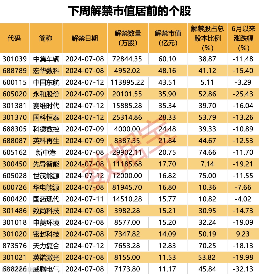 下周将有71股解禁,按照最新收盘价计算,合计解禁市值达564.11亿元,中集车辆、宏华数科、中国东航解禁市值居前。
