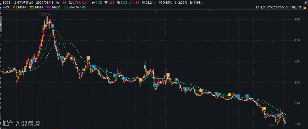 值得注意的是,截至6月18日收盘,东方集团股价报1.35元/股。把时间拉长来看,公司股价自2020年8月以来便持续走低,较高点跌超75%。
