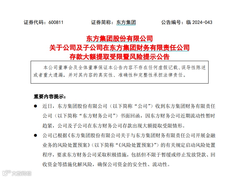 东方集团公告称,近日,公司收到东方财务公司的书面回函,因东方财务公司近期流动性暂时趋紧,公司及子公司在东方财务公司的存款出现大额提取受限情形。