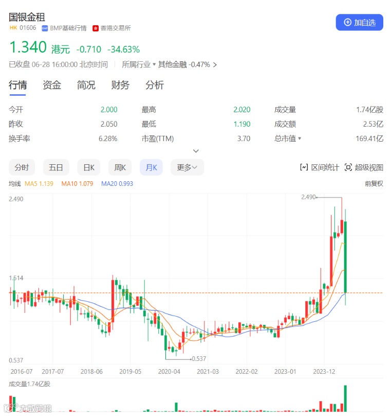 或许是资本市场闻风先动,6月28日国银金租一度下跌超过41%。截至收盘跌幅收窄至34.63%,报1.34港元/股。