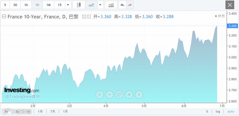 其中,法国债市遭遇自主权债务危机以来最严重的抛售,当地时间周五,法国10年期国债收益率一度飙升至3.328%,创去年11月以来的最高水平,与德国国债的利差扩大至86个基点,创2012年以来新高。