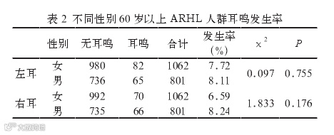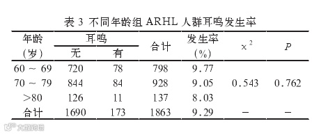 1863名60岁以上年龄相关性耳聋人群中,共有9.34%(174人)诉及持续性耳鸣;耳鸣发生率同性别无关;随着年龄增长,耳鸣发生率呈下降趋势,但无统计学意义;有耳鸣患者的纯音听阈各频率较无耳鸣受试者各频率明显升高(P<0.01)。