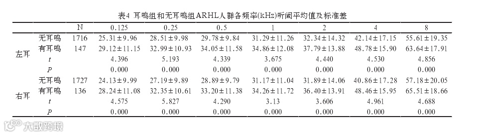耳鸣组与无耳鸣组双耳纯音听阈均随着频率的升高而升高。两组中低频(0.125~2kHz)均为轻度听力下降;4~8kHz频率范围,无耳鸣组表现为中度听力下降,耳鸣组表现为中重度听力下降。且耳鸣组双耳各频率听阈均明显高于无耳鸣组双耳各频率听阈,结果具有统计学意义(见表4)。