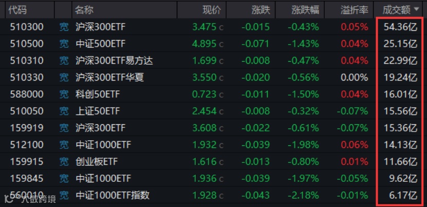 截至收盘时,全市场9只宽基ETF成交额超过10亿元,合计成交额接近200亿元。4只沪深300ETF的成交额大幅放量,合计成交了111.95亿元,较前一交易日增加46.5亿元。其中,华泰柏瑞沪深300ETF单日成交额达到54.36亿元,而前一交易日为27.61亿元;易方达沪深300ETF成交额为22.99亿元,前一交易日为11.09亿元。