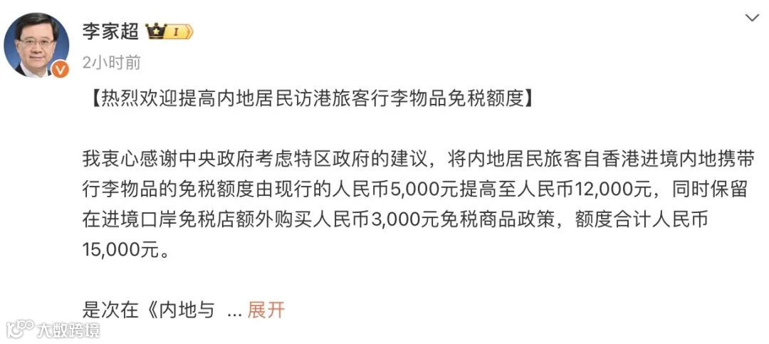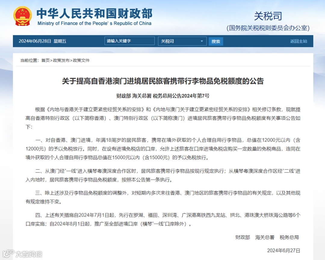 财政部、海关总署、税务总局今日公告,7月1日起,内地居民旅客自香港或澳门进境内地携带行李物品的免税额度将提高至人民币12000元,同时保留在进境口岸免税店额外购买人民币3000元免税商品政策,额度合计人民币15000元。新措施适用于罗湖、福田(落马洲支线)、深圳湾、广深港高铁西九龙站、港珠澳大桥珠海公路等六个陆路口岸,并将于8月1日在所有口岸实施。