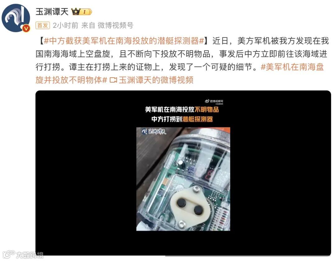 6月26日,据@玉渊谭天报道,近日,美方军机被我方发现在我国南海海域上空盘旋,且不断向下投放不明物品。事发后,中方立即前往该海域进行打捞,依法依规对不明电子物品进行检查。