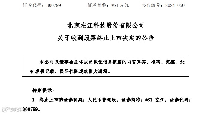 6月28日晚,深交所发布公告,决定*ST左江(300799)终止上市,7月8日进入退市整理期交易。*ST左江曾在去年7月达到299.8元/股(前复权)的高点,被称为最贵ST股。