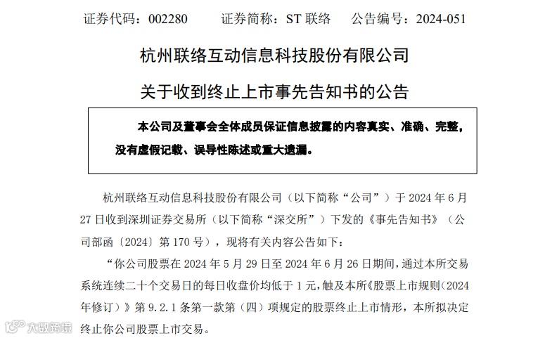 当晚,ST联络(002280)公告,公司于6月27日收到深交所下发的《事先告知书》,因连续20个交易日的每日收盘价均低于1元,触及股票终止上市情形,深交所拟决定终止公司股票上市交易。