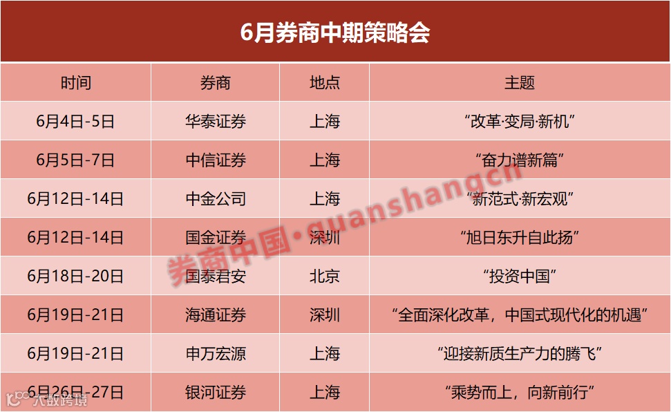 6月,一大波券商中期策略会密集来袭。就在上周,中金公司、国金证券举办了中期策略会。
