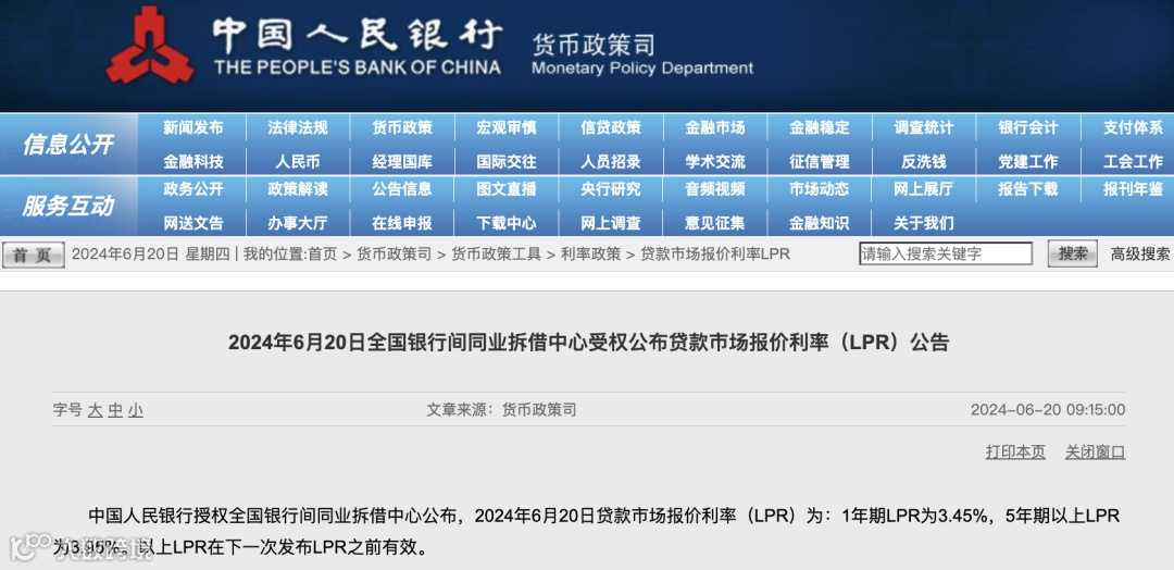 中国人民银行授权全国银行间同业拆借中心公布,2024年6月20日贷款市场报价利率(LPR)为:1年期LPR为3.45%,5年期以上LPR为3.95%。以上LPR在下一次发布LPR之前有效。