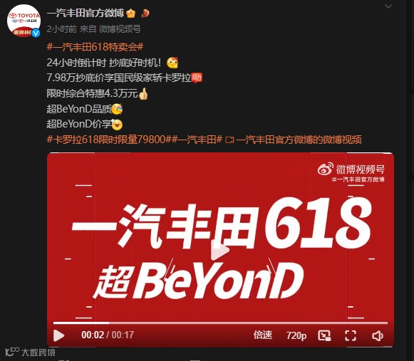 6月18日,一汽丰田官方微博发布消息,即日举行24小时限时特卖会。