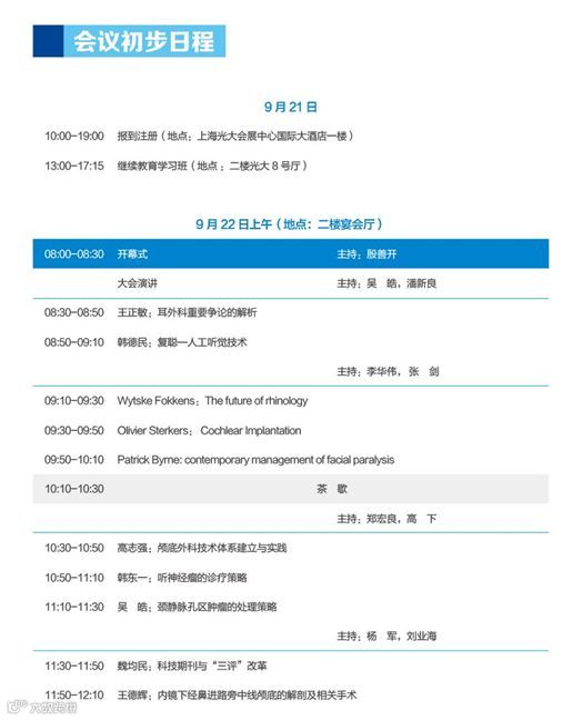 第三届东方耳鼻咽喉-头颈外科会议暨第十三届华东六省一市耳鼻咽喉-头颈外科学术会议将于2018年9月21~23日在上海光大会展中心国际大酒店召开,由海市医学会主办上海市医学会,上海市医学会耳鼻咽喉头颈外科分会承办;江苏省医学会耳鼻咽喉头颈外科分会:浙江省医学会耳鼻咽喉头颈外科分会,安徽省医学会耳鼻咽喉头颈外科分会,江西省医学会耳鼻咽喉头颈外科分会,山东省医学会耳鼻咽喉头颈外科分会,福建省医学会耳鼻咽喉头颈外科分会(按华东六省一市会议举办顺序为序)联合承办。