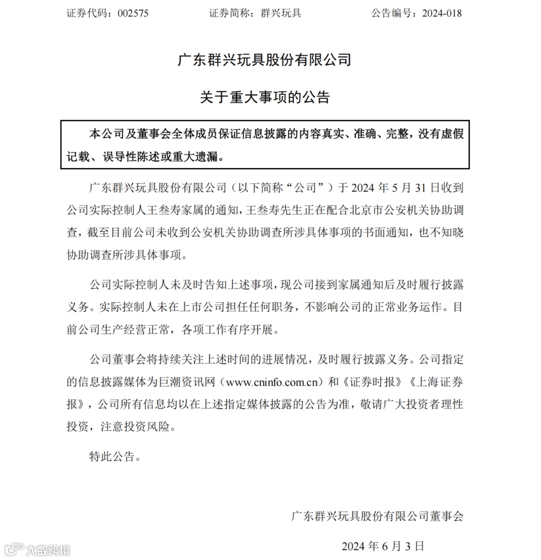 6月2日,上市公司群兴玩具公告,公司于5月31日收到公司实际控制人王叁寿家属的通知,王叁寿正在配合北京市公安机关协助调查。截至目前,公司未收到公安机关协助调查所涉具体事项的书面通知,也不知晓协助调查所涉具体事项。