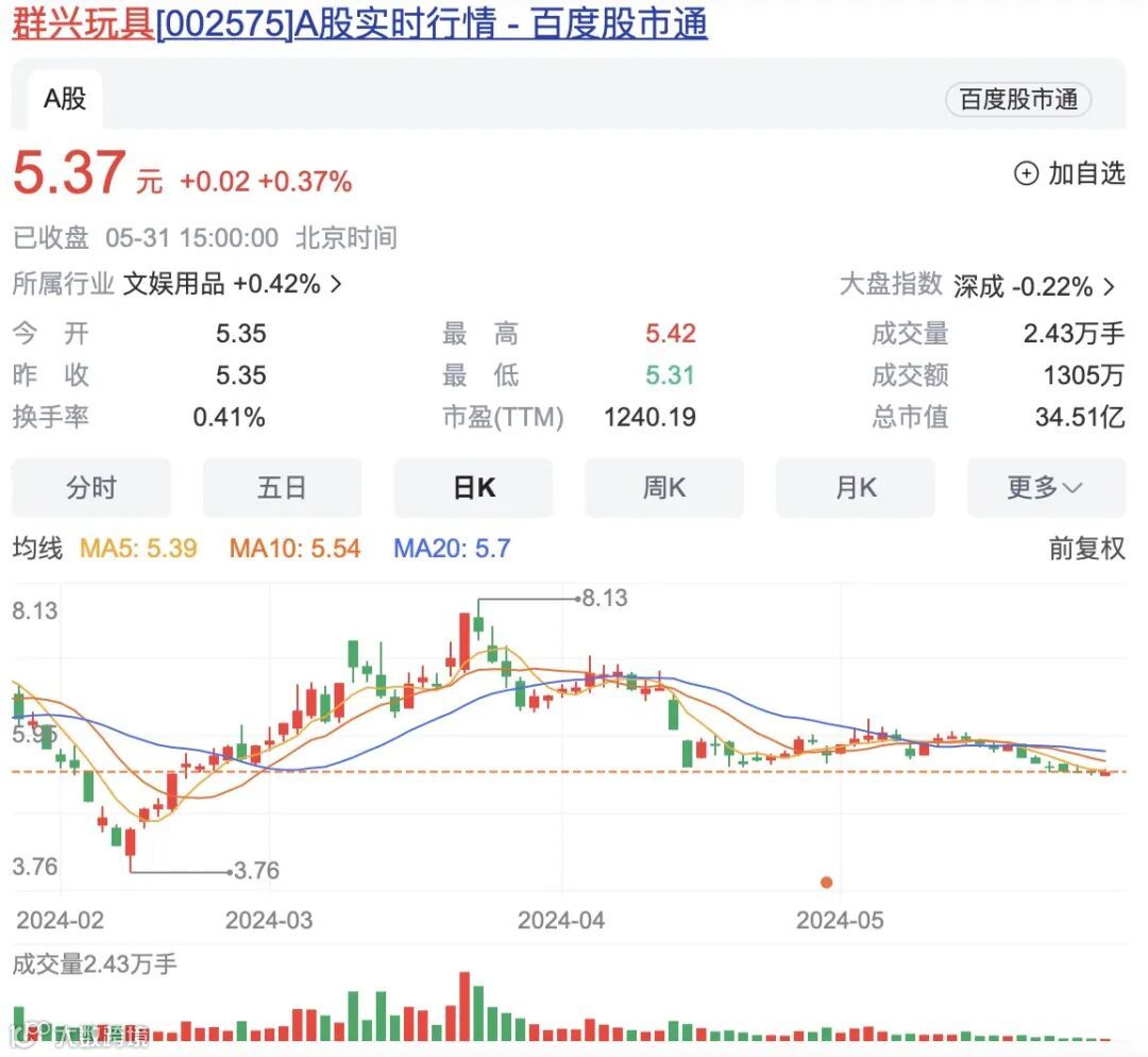 目前来看,群兴玩具的玩具制造业务已经剥离。根据2023年年报显示,群兴玩具主营业务为酒类销售业务、自有物业租赁及园区运营和物业管理服务业务。股价方面,Wind数据显示,截至5月31日收盘,群兴玩具股价报5.37元/股,最新市值为35亿元。