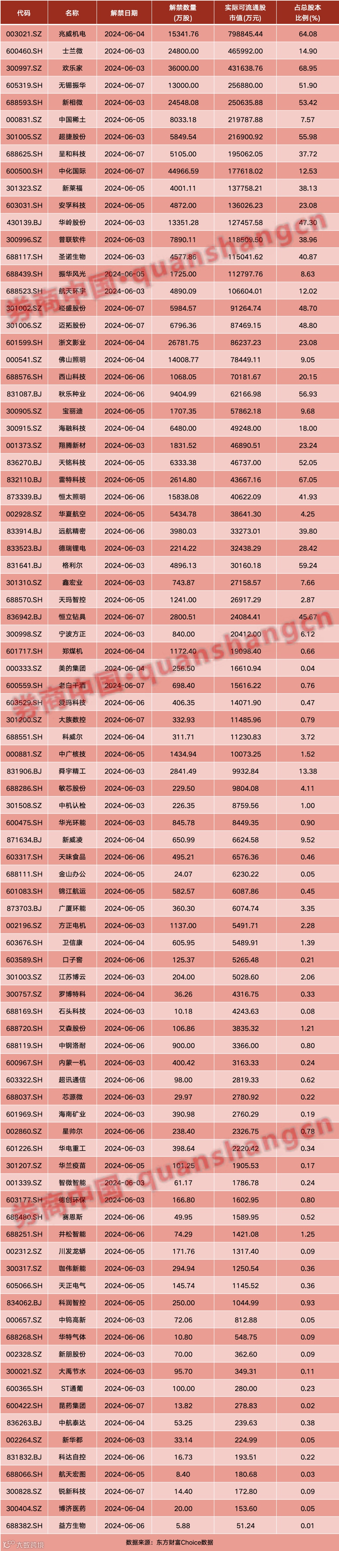 数据显示,本周(6月3日~6月7日)共有88家公司限售股陆续解禁,合计解禁量35.73亿股,按5月31日收盘价计算,解禁市值为509.82亿元。