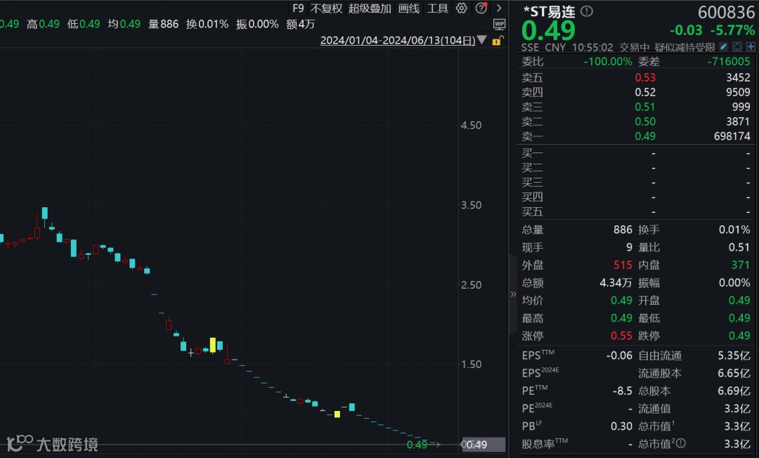6月13日,*ST易连继续跌停,这是该股近期第13个跌停板。