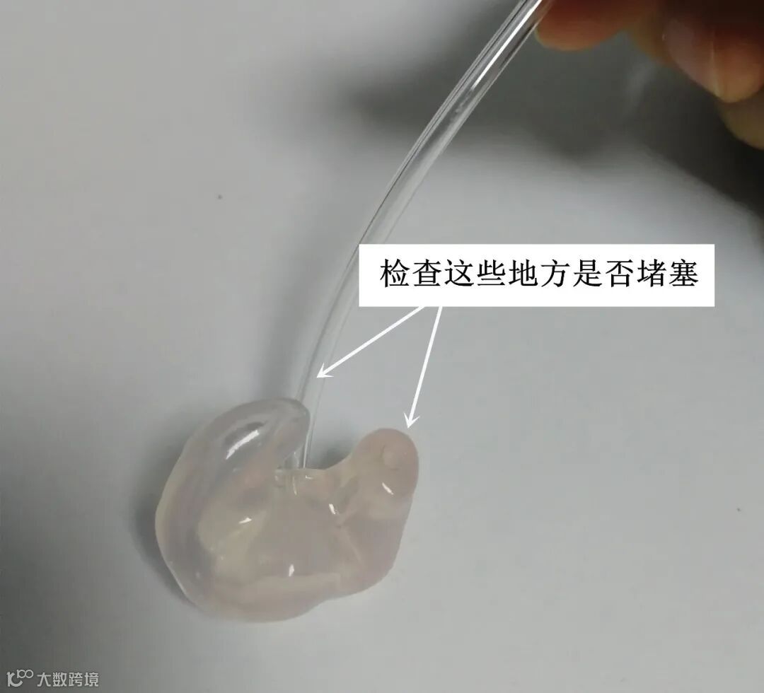 5. 用清水冲干净耳模,并用风泵吹干导声管,之后装上助听器。