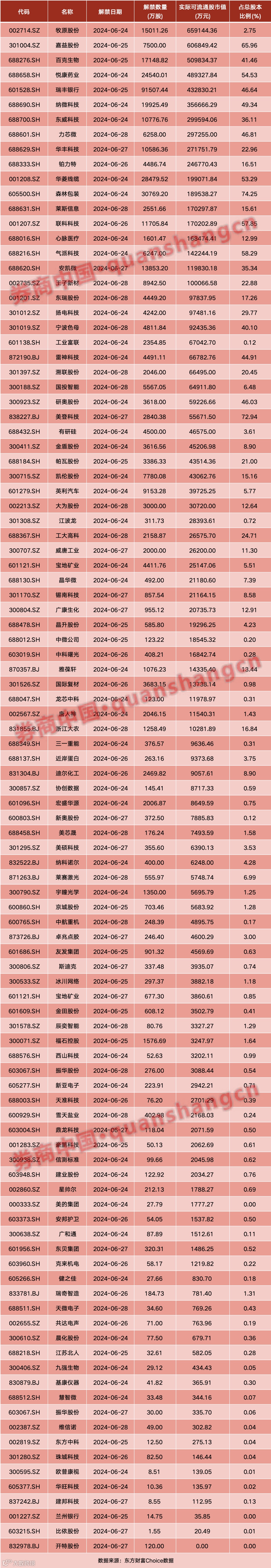 数据显示,本周(6月24日~6月28日)共有103家公司限售股陆续解禁,合计解禁量41.54亿股,按6月21日收盘价计算,解禁市值为679.75亿元。