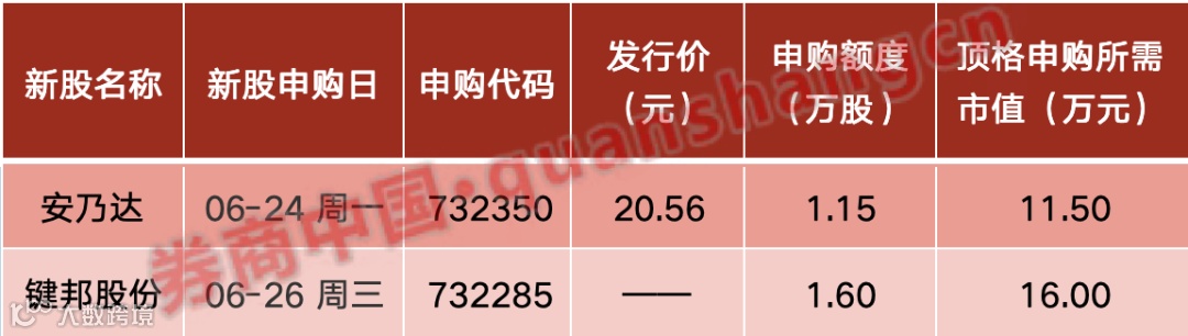 本周(6月24日~6月28日)有2只新股发行。周一:安乃达;周三:键邦股份。