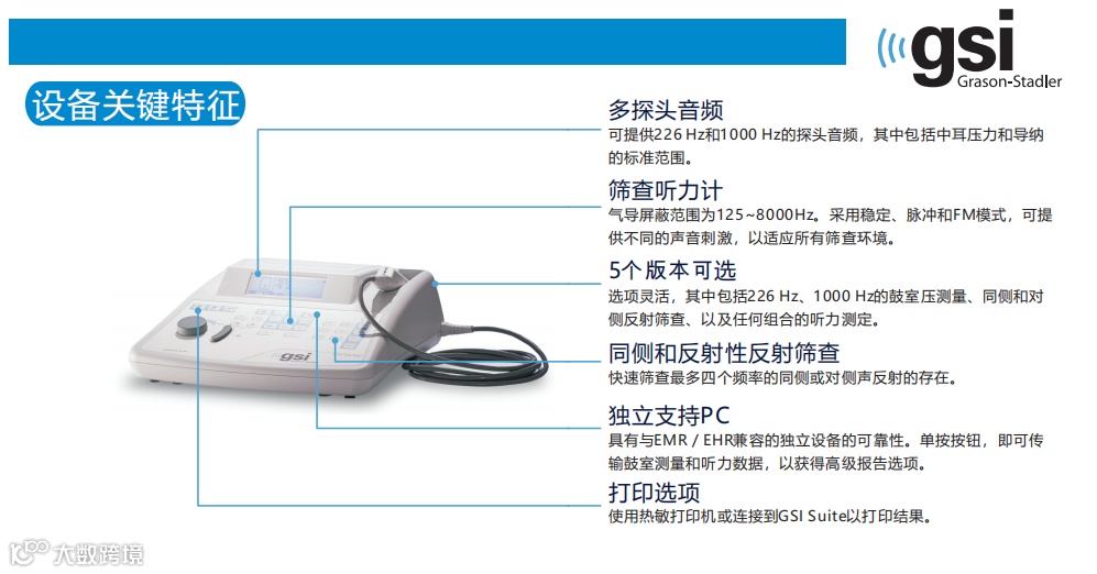 GSI 39™是一种灵活的筛查产品,适用于鼓室导抗测试、声反射测量和听力测量,以满足当前和未来的测试需求。GSI 39共有五种不同版本,既可以立即选择所需要的功能,也可以根据未来需求的变化,使用其他功能升级设备。