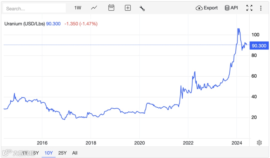 今年3月,国际铀价一度突破100美元/磅,接近16年来新高,全球经济指标网最新数据显示,5月30日,国际铀价仍处于90美元/磅上方,相比2023年年初,累计涨幅达84%。