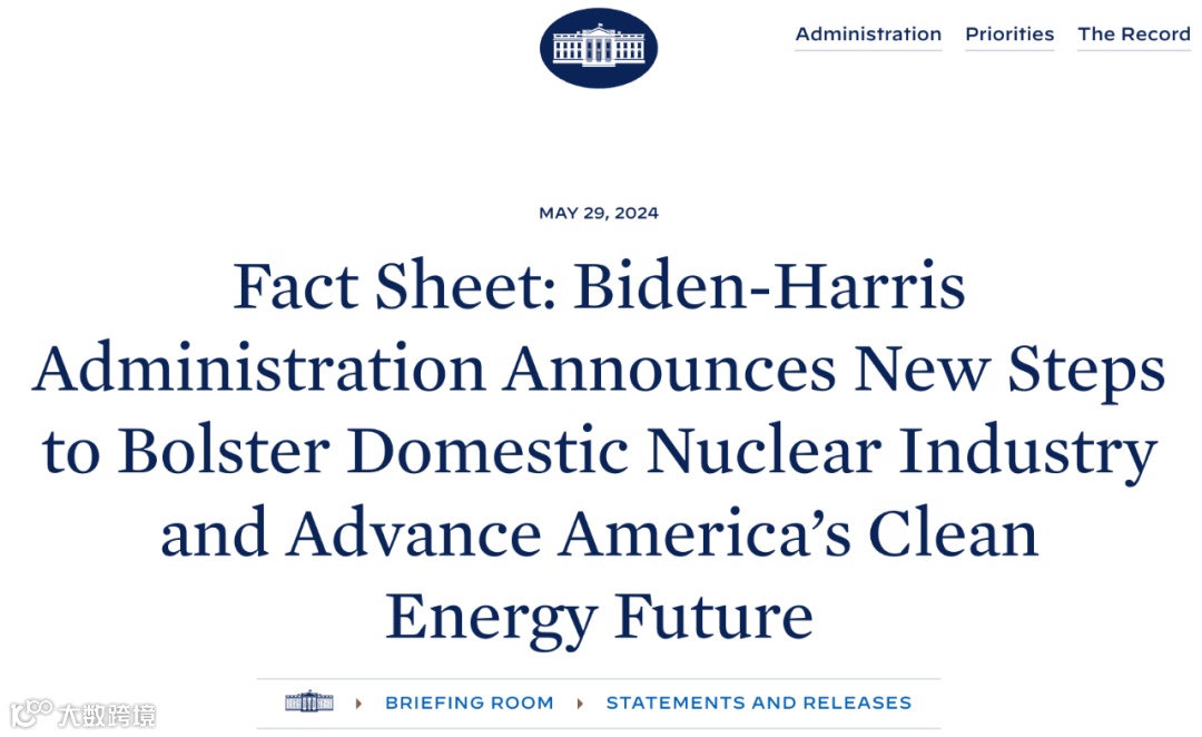 美国白宫发布的公告,概述了拜登政府的多项核电支持政策,大致可以分为四个方面:提供资金支持现有核电站延长服役、推动新型核电站部署、简化新核电站报批建设和既有核电站扩容的许可流程,以及推进浓缩铀等供应链的发展。