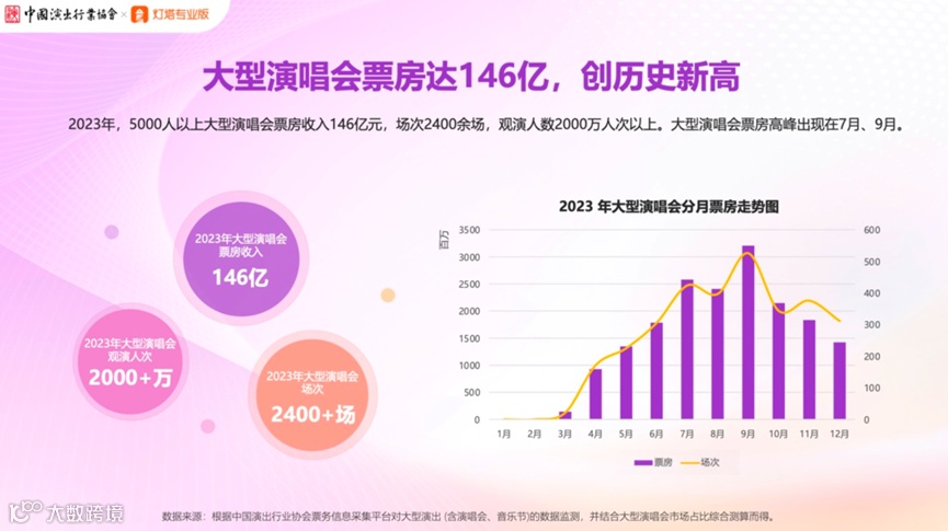 2023年,5000人以上的大型演唱会、音乐节演出场次共0.31万场,比2019年增长97.23%。共取得票房177.96亿元,比2019年增长348.98%。其中,5000人以上的大型演唱会2400余场,票房收入146亿元,创历史新高。
