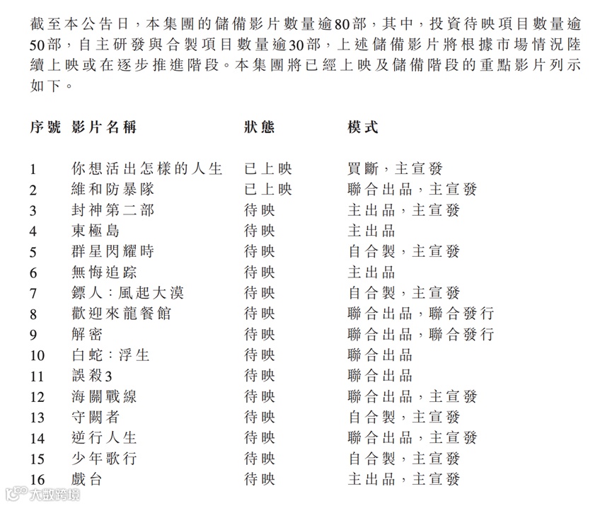 截至目前,阿里影业的储备影片数量超过80部。其中共计投资待映项目超过50部,自主研发与合制项目超过30部。这些影片包括《封神第二部》《误杀3》《东极岛》等,阿里影业表示,储备影片将根据市场情况陆续上映或逐步推进。
