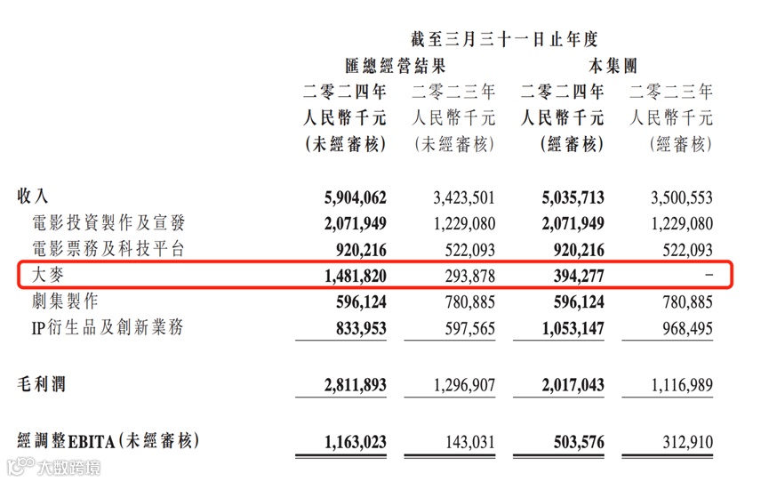 根据对大麦的收购节点,阿里影业将大麦网自2023年12月至2024年3月的财务数据并表,这期间大麦的收入为3.94亿元。