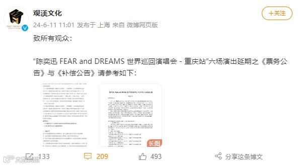 上述公告还提及,陈奕迅目前状况稳定,需继续留院接受治疗护理,请大家放心。同时,主办方也发布了重庆站六场演出延期的《票务公告》与《补偿公告》。