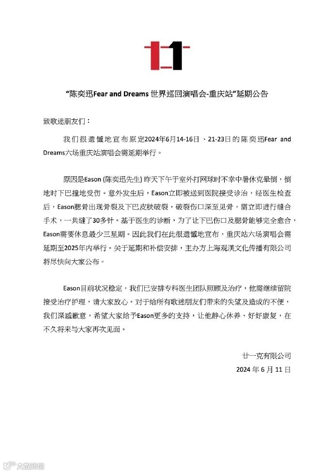 6月11日,陈奕迅方发布演唱会重庆站延期公告称,陈奕迅昨天下午在室外打网球时不幸中暑休克晕倒,导致下巴撞地受伤。