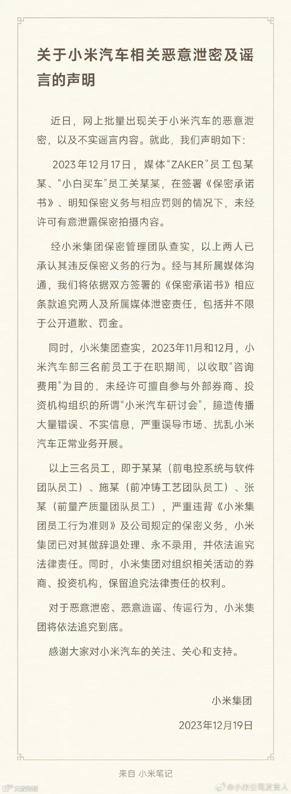 值得注意的是,2023年年底,网络上出现了小米汽车的实车拍摄现场照片,据悉为有人泄密导致。12月19日晚,小米科技有限责任公司官方微博发布了《关于小米汽车相关恶意泄密及谣言的声明》。小米表示,将追究两名媒体人的泄密责任,同时,对三名擅自参与外部机构所谓“小米汽车研讨会”、臆造传播大量错误不实信息误导市场的前员工进行辞退处理、永不录用,并依法追究法律责任。