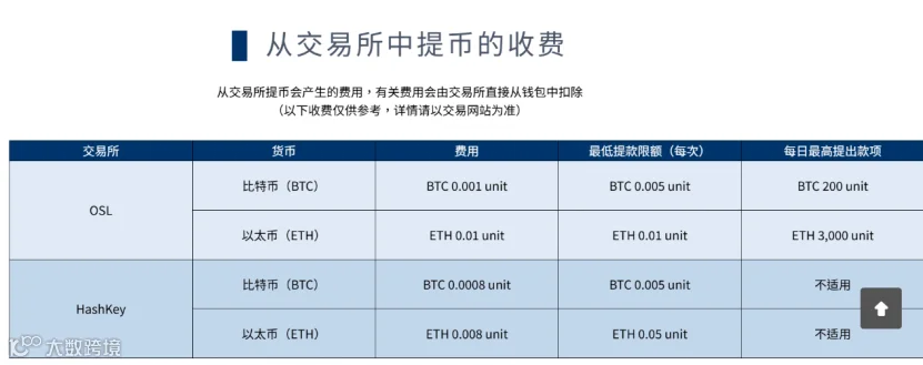 对于虚拟资产的交易手续费用,不同的交易所收费标准略有区别。目前香港证监会仅批准了2家虚拟资产交易平台。对于OSL交易所,比特币(BTC)的费用是BTC0.001unit,以太币(ETH)的费用是ETH0.01unit。对于HashKey交易所,比特币(BTC)费用是0.0008unit,以太币(ETH)费用是ETH0.008unit。
