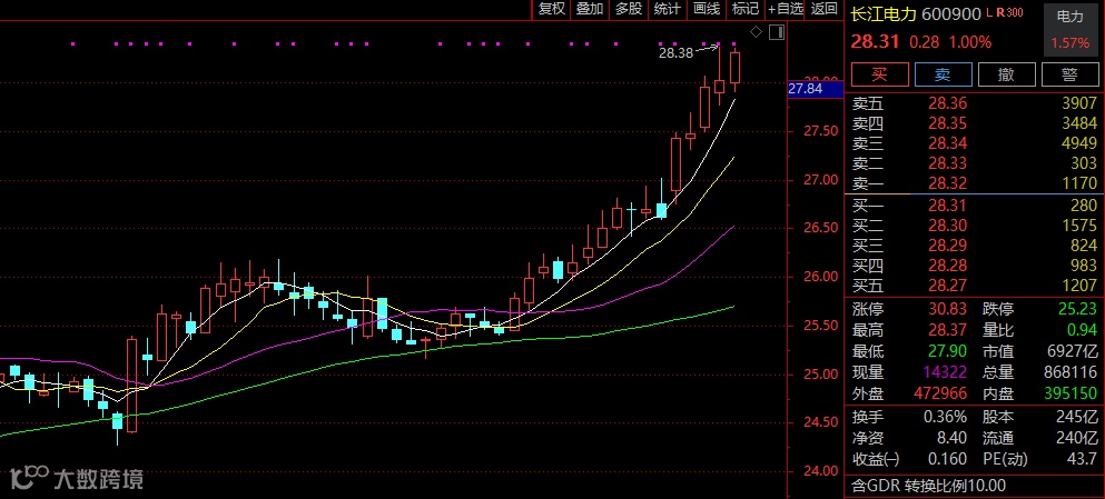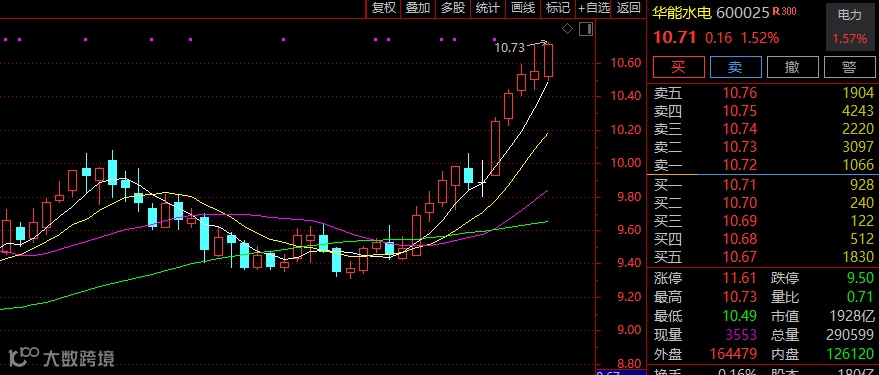 截至收盘,长江电力股价上涨1%,收于28.31元/股;华能水电股价上涨1.52%,收于10.71元/股。近期两股呈不断突破之势,收盘价均在7日创下历史新高。