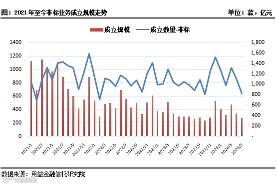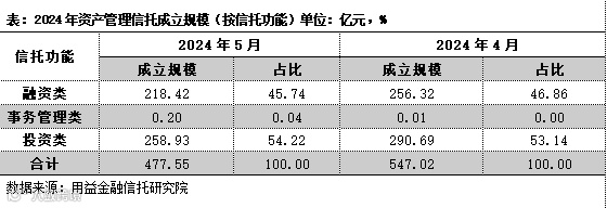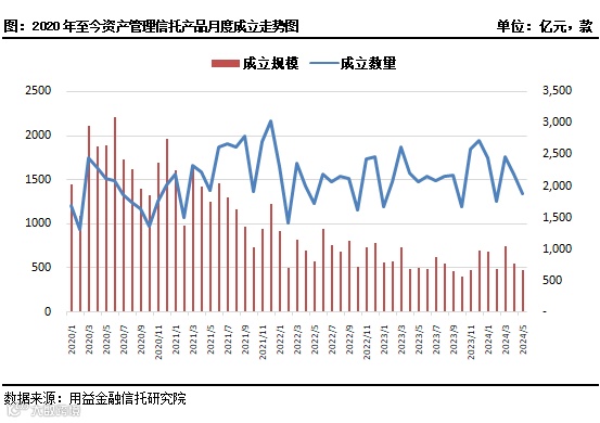 另据公开资料不完全统计,截至2024年6月3日,5月共计成立资产管理信托产品1873款,环比减少14.24%,成立规模为477.55亿元,环比减少12.70%。5月资产管理信托成立市场下行的主要原因是非标信托产品的资金募集规模有较为明显的下滑,而标品信托产品的成立表现相对稳健。