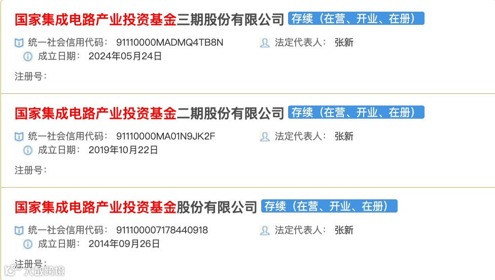 国家集成电路产业投资基金此前已成立过两期,分别成立于2014年9月26日和2019年10月22日,注册资本分别为987.2亿元和2041.5亿元。