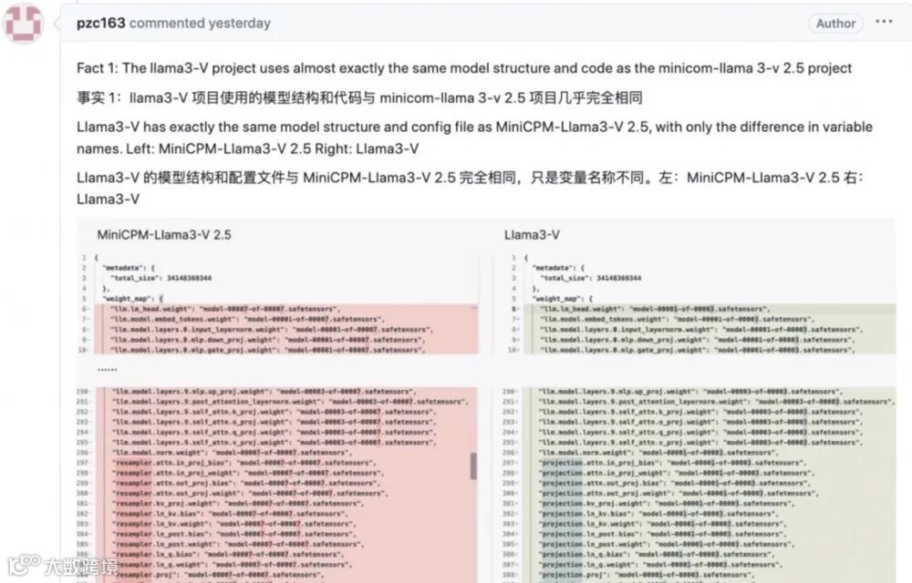 随后,有热心网友发现,Llama 3-V与清华系大模型创业公司面壁智能的MiniCPM-Llama3-V 2.5在模型结构、代码、配置文件等方面几乎一模一样,只是斯坦福AI团队将其中的变量名称做了更改。该网友更是直接将相关的关键证据一一截图,进行列举证明。