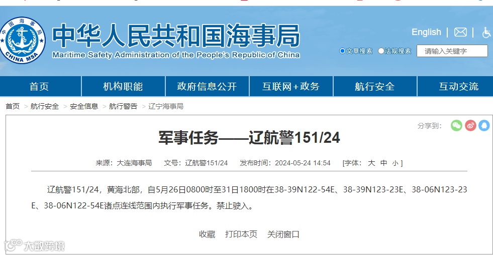 大连海事局发布航行警告,5月26日8时至31日18时,黄海北部部分海域执行军事任务,禁止驶入。 来源:大连海事局 责编:王璐璐 校对:冉燕青 百万用户都在看 美国,突然"变脸"!乌首都拉响防空警报! 1300万人死亡!世卫组织,突然发布! 两大变数突袭! 首次!特朗普,超越拜登! 惊魂"乌龙指"!5分钟暴跌2.36万亿元,这家投行被重罚! 违法和不良信息举报电话:0755-83514034 邮箱:bwb@stcn.com