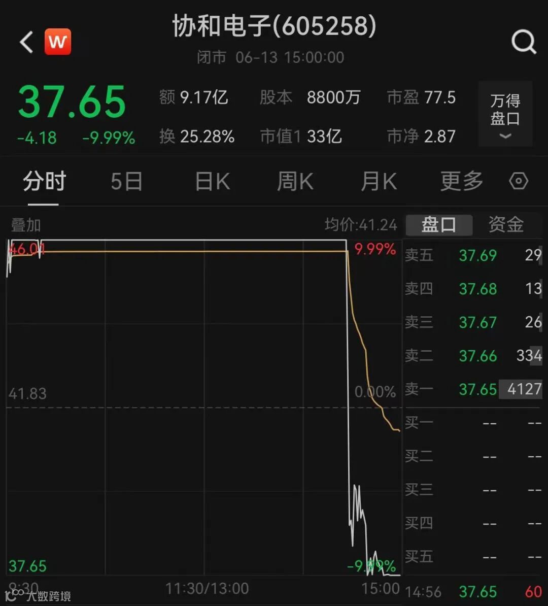 连续7日涨停的协和电子今日早盘再度涨停,但尾盘“炸板”,直线跳水跌停,止步8连板。截至收盘,该股报37.65元,成交超9亿元。