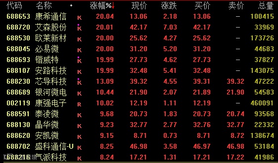 半导体板块盘中大幅走高,截至收盘,康希通信、艾森股份、欧莱新材、必易微、锴威特、安路科技等多股“20cm”涨停,芯导科技涨超13%,银河微电涨超10%。