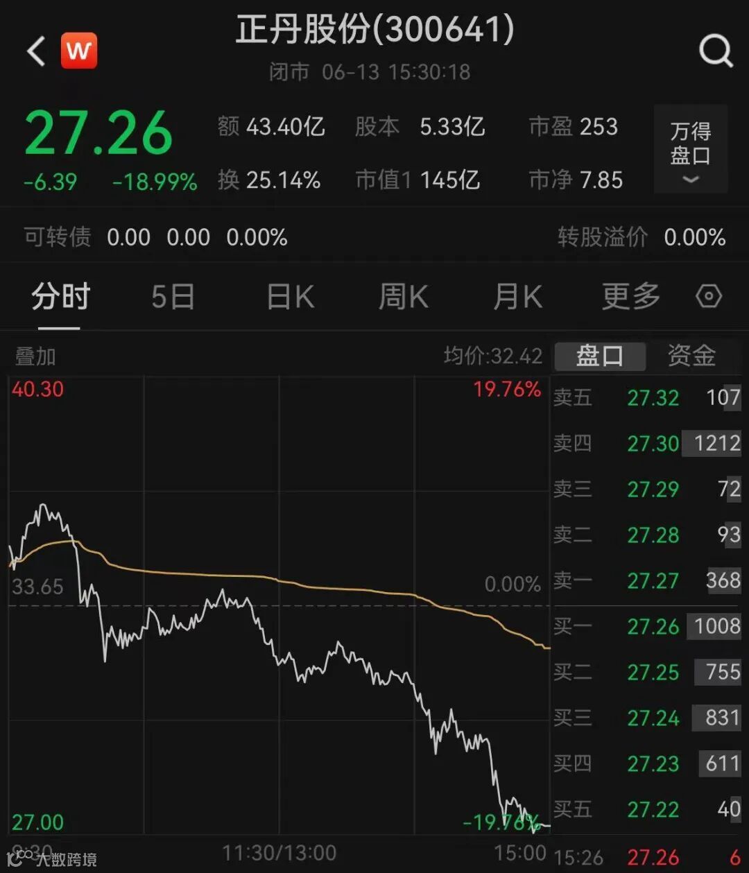 此外,正丹股份早盘大幅拉升,一度大涨约9%再创历史新高,但尾盘快速跳水,一度逼近跌停。收盘跌约19%,成交43.4亿元。值得注意的是,该股当前高点已较年内低点大涨近12倍。