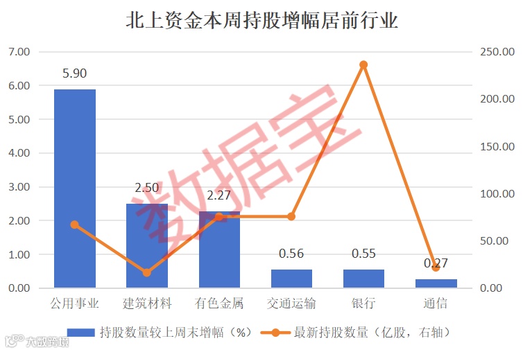 据证券时报·数据宝统计,北上资金本周(5月20日~5月24日)加仓6个申万一级行业,3个行业持仓数量环比增加超2%,其中公用事业行业增幅最为显著,持股数量由上周末的63.05亿股增加至66.76亿股,增幅达5.90%。