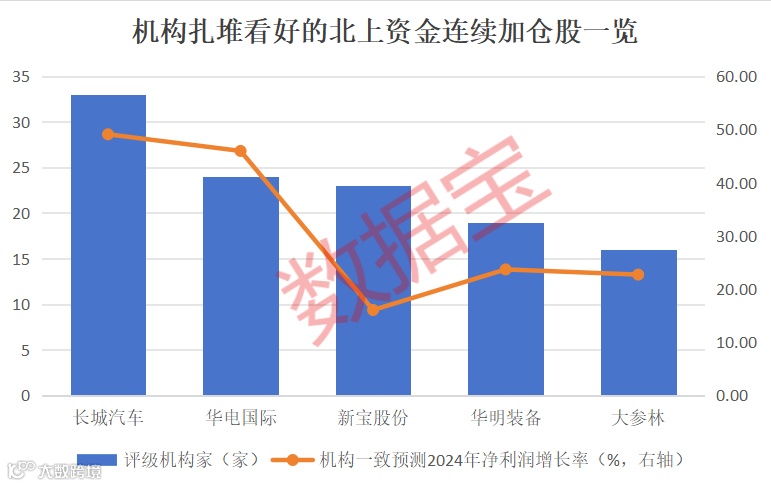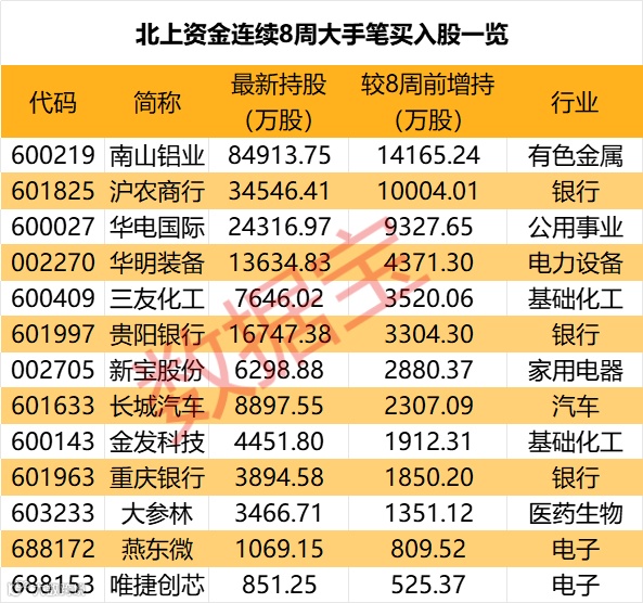 据数据宝统计,在北上资金连续8周增持的个股中,有13股获大手笔加仓,最新持股数量较8周前增加均超500万股。