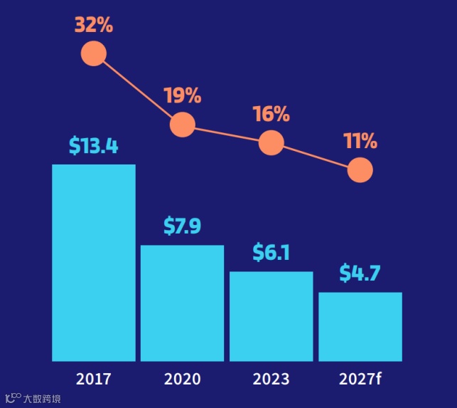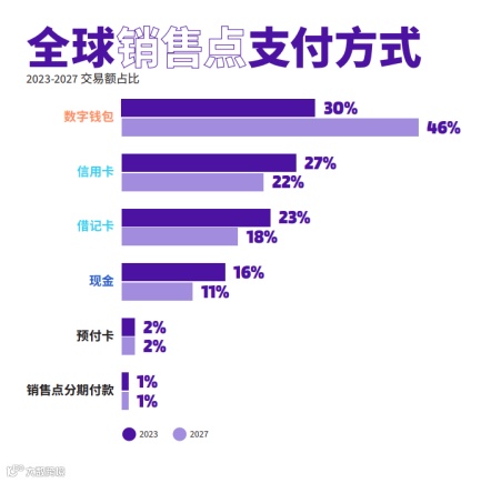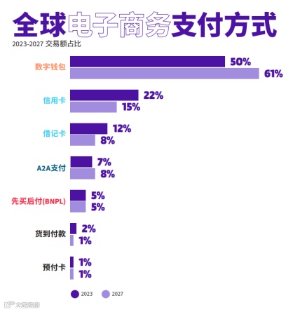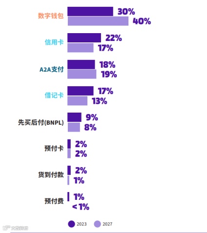 报告显示,2023年其在全球电商交易额的占比达50%。数字钱包是增长最快的电子商务支付方式,预计到2027年复合年均增长率为15%。报告预计到2027年,电子商务交易中直接使用信用卡和借记卡支付的交易额将略有下降。然而,这种“下降”很大程度上是因为银行卡的直接消费支出变身成了数字钱包的消费支出。