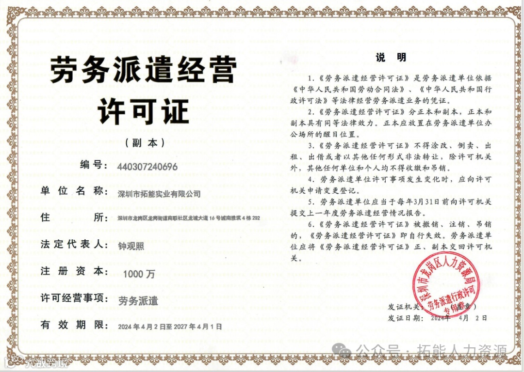 拓能实业,正是看到这个时代机会,既能帮助普通劳务工解决就业问题,也能为中国和中国香港经济复苏,贡献一点微薄力量。拓能劳务隶属于深圳市拓能实业有限公司的新板块业务,一站式专注于协助内地劳工输送香港工作服务,提供劳工供求信息咨询、人力资源开发与管理咨询、委托推荐和招聘的企业,是经深圳市龙岗区人力资源局批准经营的一家合法正规专业化的劳务派遣公司。