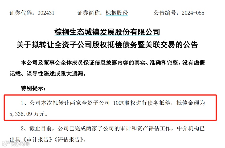 6月7日晚间公告显示,棕榈股份拟将下属两家全资子公司上海棕合商业经营管理有限公司(简称“上海棕合”)、海口棕榈商业运营管理有限公司(简称“海口棕榈”)100%的股权,转让给公司控股股东河南省豫资保障房管理运营有限公司(简称“豫资保障房”),交易金额5336.09万元。转让价款将全部用于清偿公司欠付受让方的部分债务。