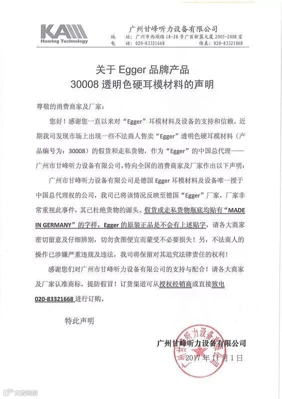 您好!感谢您一直以来对“Egger”耳模材料及设备的支持和信赖。近期我司发现市场上出现一些不法商人售卖“Egger”品牌透明色硬耳模材料(产品编号为:30008)的假卖和货物走私,作为“Egger”的中国区总代理——广州甘峰听力设备有限公司,我们在此特向全国的消费商家及厂家郑重做出以下声明: